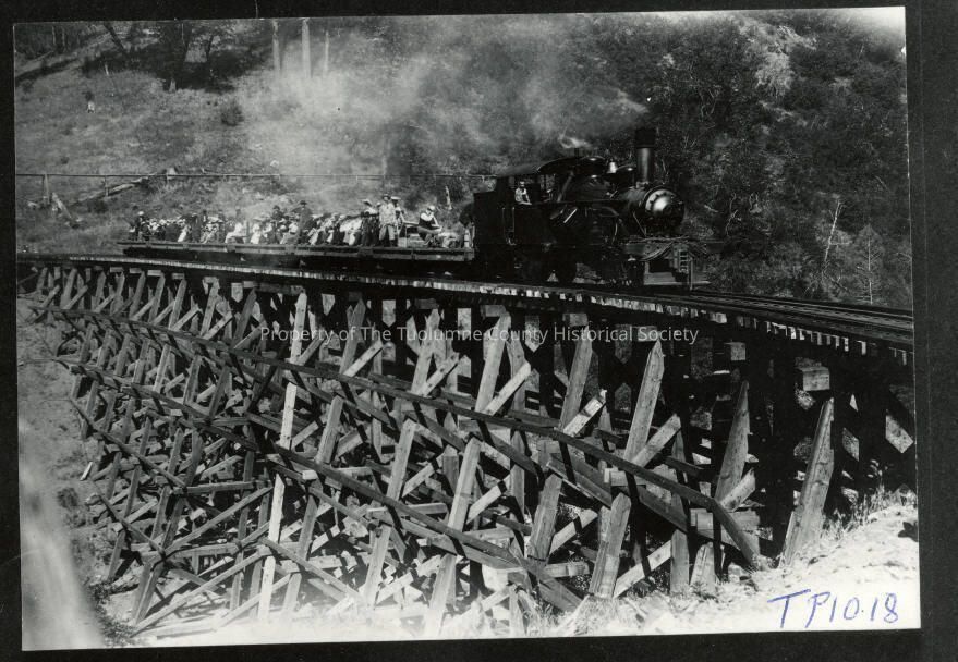 Group -Train on trestle. Heisler #1 over the South Fork of the Tuolumne River. Annual excursion and outting of the West Side Lumber Co., 1902. Now extinct town of Nashton (Camp 8). Employees and friends were carried on company's logging flat cars.