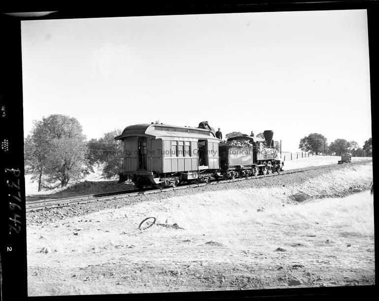 Negative for photo TP17655. Locomotive #3 below Jamestown working as a movie train. It appears that the engine is lettered for the Ohio & Mississippi. The car appears to be combination car #5 purchased for use on the Angels Branch. It was acquired in July of 1907, and valued at $3435. ("A Railroad Transplant, The Sierra Railroad Company of California" by Richard Rosenquist).
