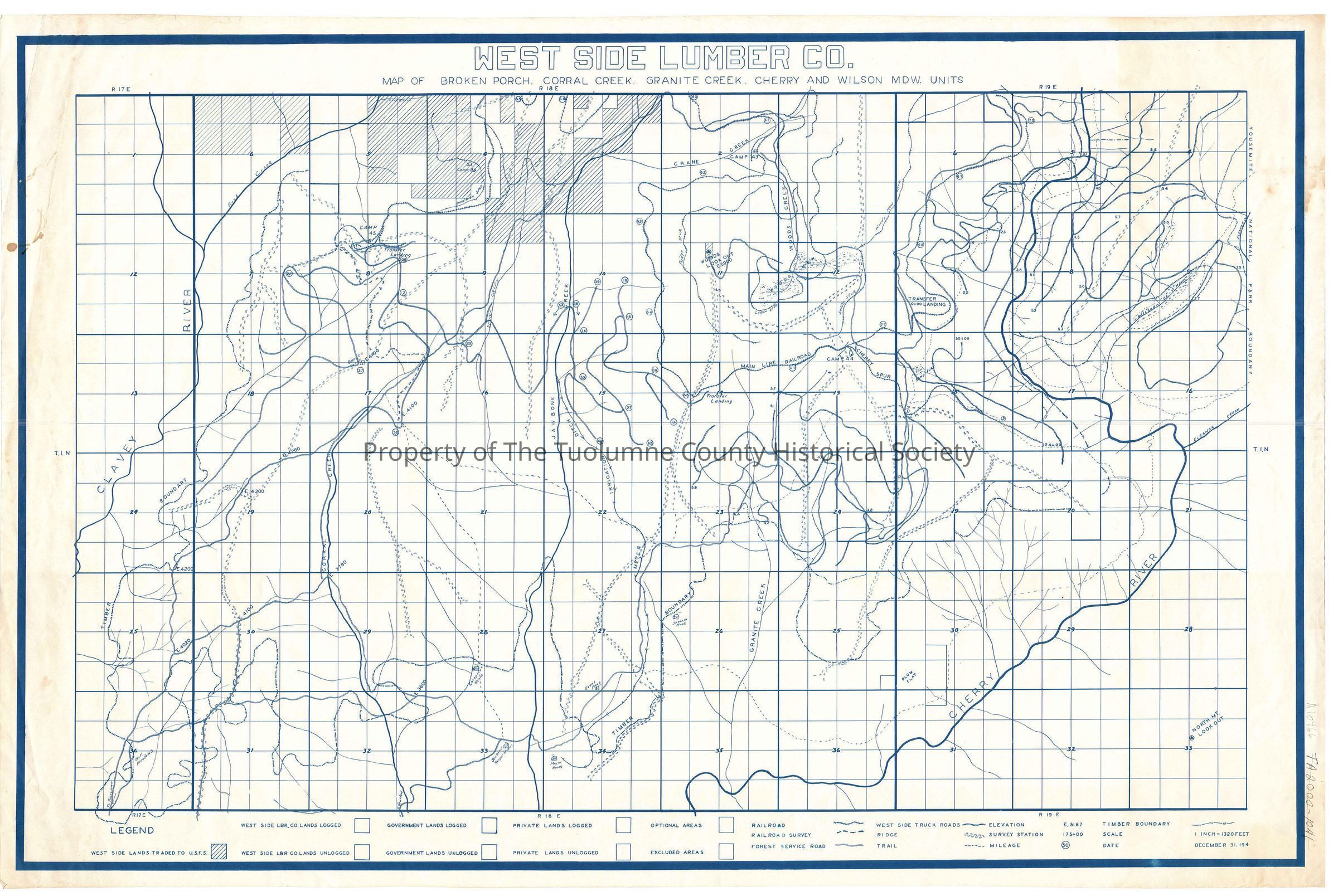 Forest Map, logging map, railroad map, Clavey River, Reed Creek, Crane Creek, Woods Creek, Wilson Creel, Eleanor Creek, Cherry River, Jawbone Creek, Meyer Irtrigation Ditch, Corral Creek, Granite Creek, North Mountain Lookout, Meyer Ranch, Jawbone Ranger Station, Caragnero Ranch, Evans Place, Speaker Place, Broken Porch, Broken Porch, Corral Creek, Granite Creek, Cherry and Wilson Meadow Units