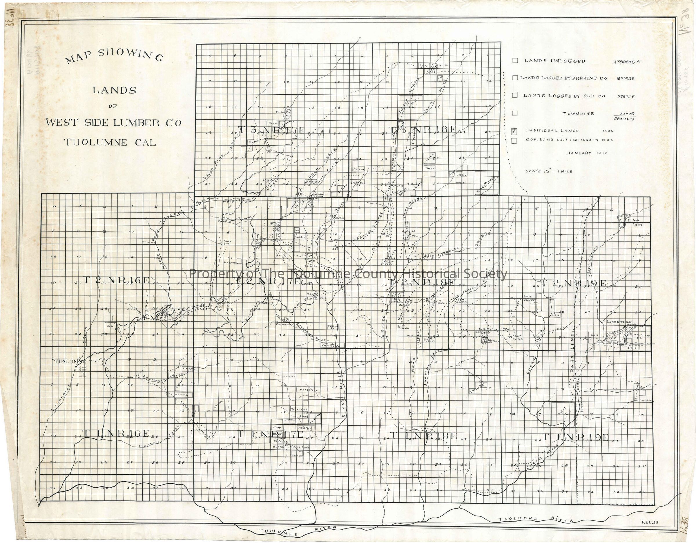 forest map, logging industry, railway right of way, Tuolumne, Trout Creek, Clavey River, Rush Creek, Hull Creek, Wrights Creek, Sugar Pine Creek, North Fork of the Tuolumne River, Two Mile Creek, Reed Creek, Reynolds Creek, Jawbone Creek, Kibble Creek, Niagara Creek, Turnback Creek, Duckwall Creek, Cottonwood Creek, Bear Creek, Hunter Creek, Camps 8, Camp 17, Camp 19, Camp 20, Camp 21, Camp 22, Hetch Hetchy & Yosemite Valleys Railway, West Side Lumber Co timber lands
