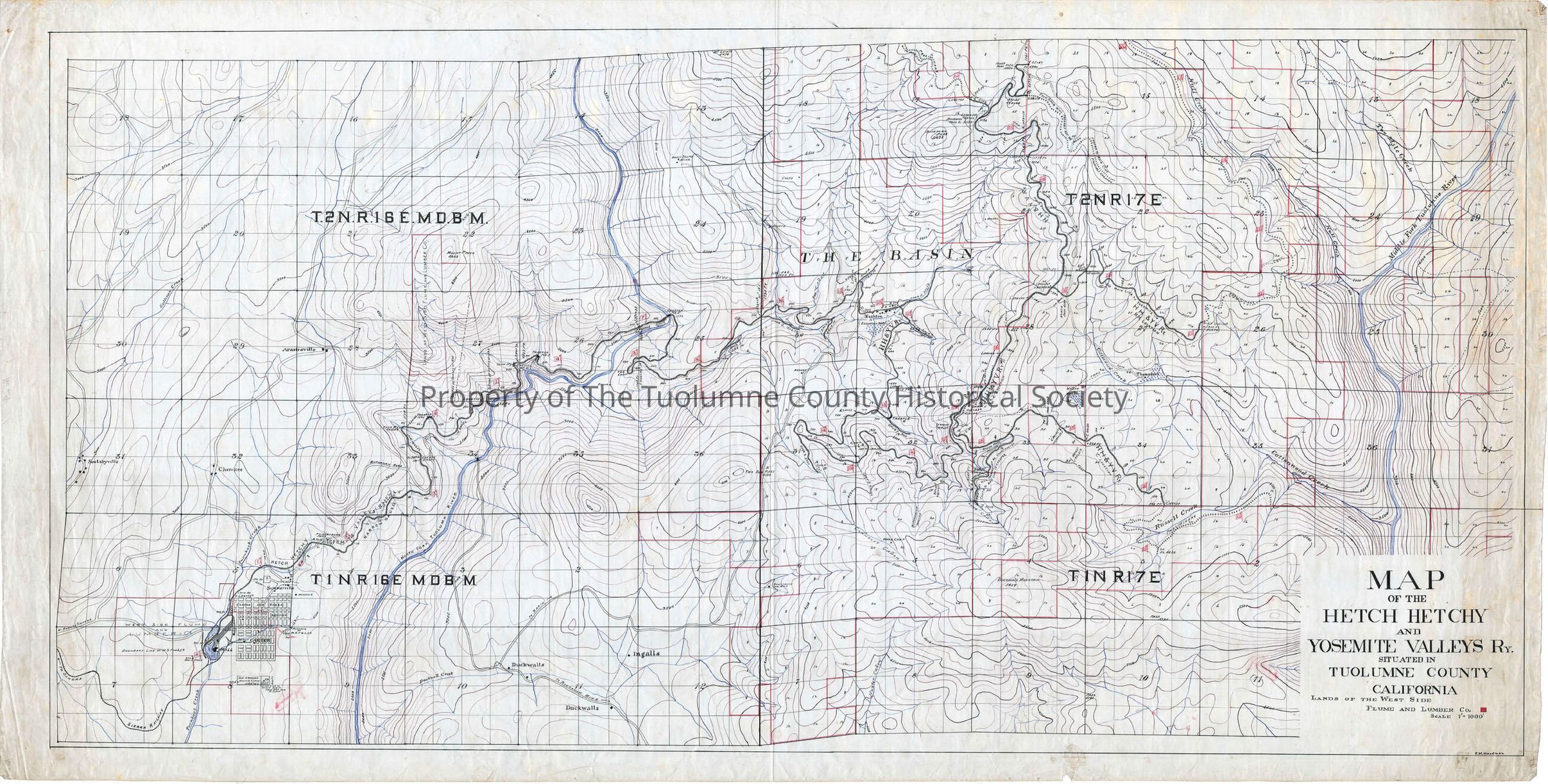 forest map, logging industry, railway, Hetch Hetchy & Yosemite Valleys Ry., Road to Sonora, Sierra Railway, Road north from Arastaville, Road north from Soulsbyville, Buchanan Road, Road to Nashton, Turnback Creek, North Fork of the Tuolumne River, Sullivan Creek, Hull Creek, Two Mile Creek, Middle Fork of the Tuolumne River, Cottonwood Creek, Basin Creek, Russell Creek, Duckwall Creek, Basin Slope Mine, Scotts, Thompson's, Nashton, Arastaville, Soulsbyville, Cherokee, Summerville, Carter, Duckwalls, Ingalls, Providence sawmill, Shake camp, Old Groesus mining claim, Hetch Hetchy & Yosemite Valleys Railway, Lands of the West Side Flume and Lumber Co.