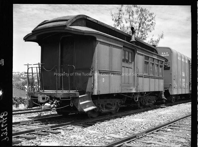 Negative for photo TP17703. Sierra RR combination coach #5. This little coach was constructed with a short wheel base to allow it to negotiate the sharp and frequent curves found along the lines angels branch. No. 5 earned a small measure of fame when it was rendered in model kit form to be assembeled by railroad enthusiasts, according to "A Railroad Transplant, The Sierra Railway Company of California" by Richard Rosenquist dated 1988.Collection