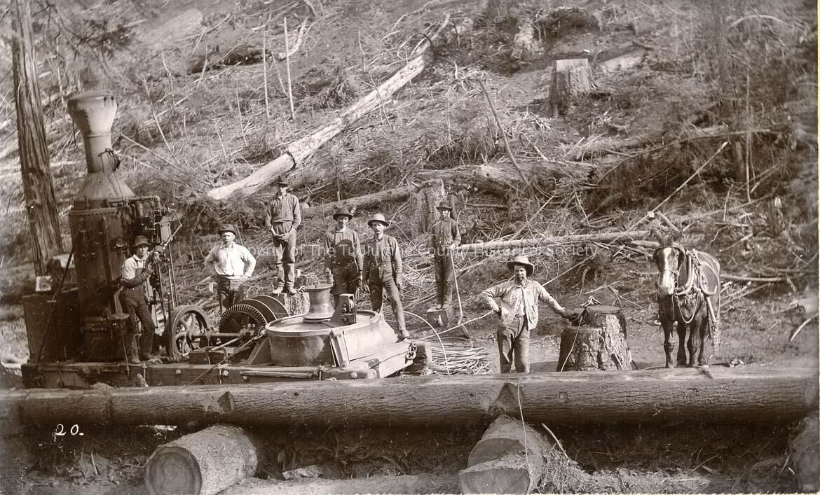A steam donkey crew pose for a photo in the forest. West Side Lumber
