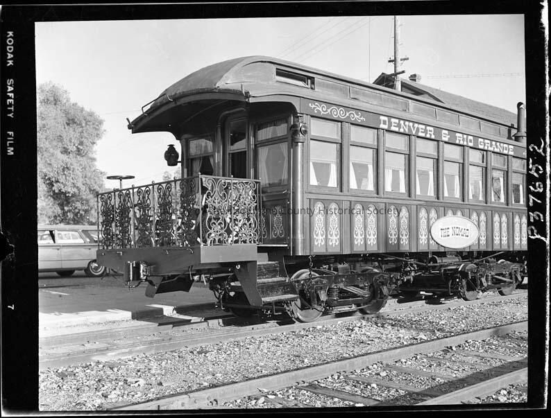 Negative for photo TP17667. According to "A Railroad Transplant, The Sierra Railway Company of California" by Richard Rosenquist dated 1988 cars 2 and 3 were the only full passenger cars. #2 was sold in 1925. Based on that logic this should be car number 3 painted as the Nomad on the Denver and Rio Grande RR for a movie. A 1960 Ford station wagon can be seen in the backgroundCollection