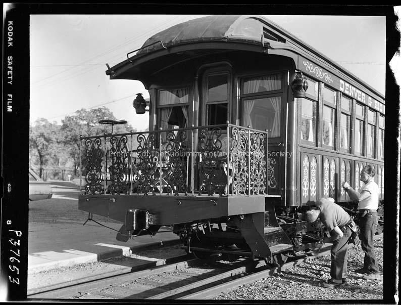 Negative for TP17669. According to "A Railroad Transplant, The Sierra Railway Company of California" by Richard Rosenquist dated 1988 cars 2 and 3 were the only full passenger cars. #2 was sold in 1925. Based on that logic this should be car number 3 painted as the Nomad on the Denver and Rio Grande RR for a movie. This photo shows two men completing the painting of the car.Collection