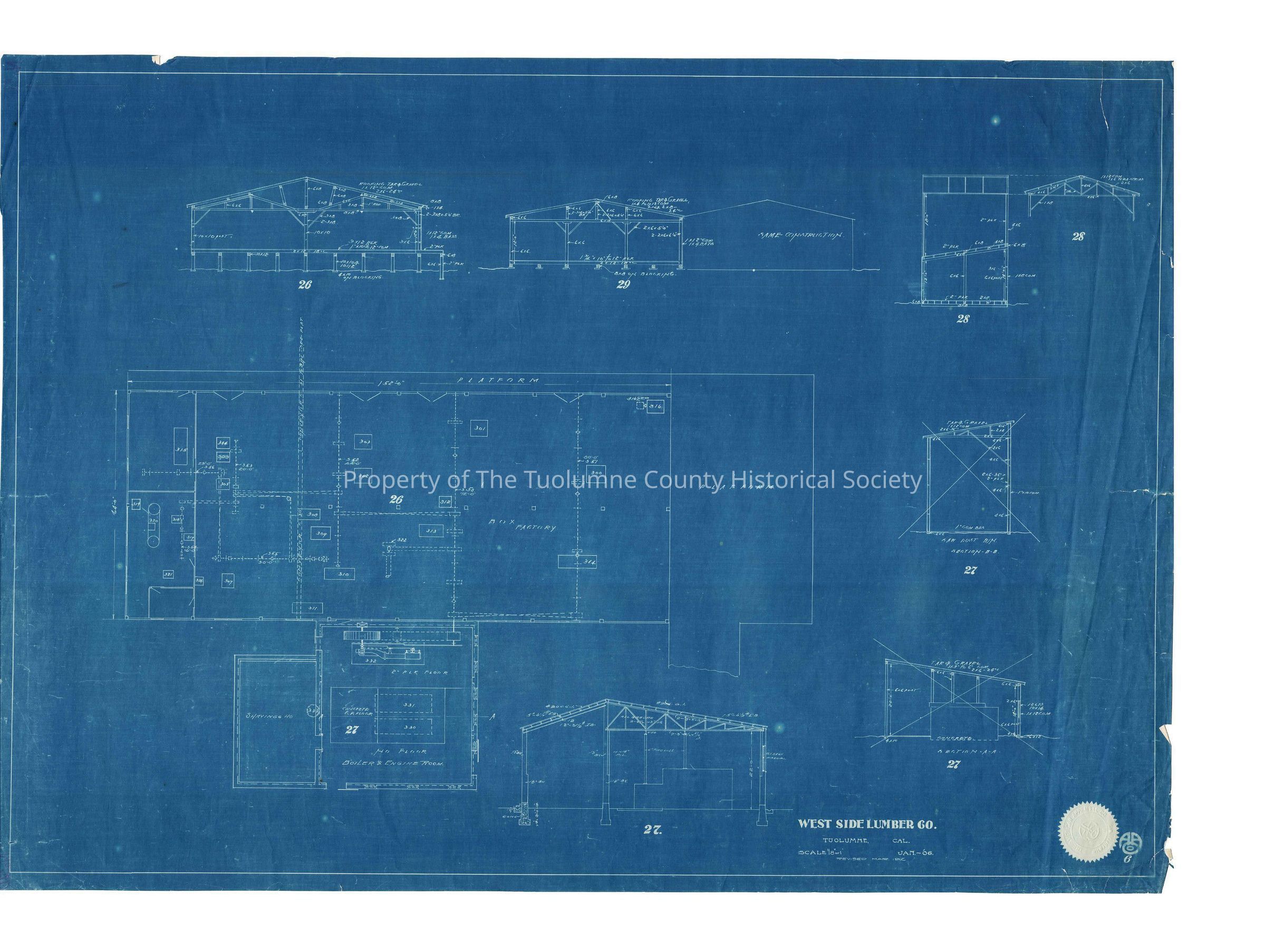 Technical drawing, blueprint, Buildings 26 thru 29, Tuolumne California, West Side Lumber Co., shook house, box factory, Box Factory and Associated Buildings, (Buildings 26, 27, 28 & 29.)