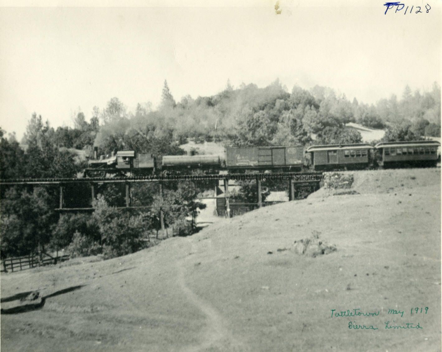 Landscape photo of a train crossing a trestle amidst hills lined with trees. Bare hill in foreground; train & trestle in middleground; tree-lined hills in background. Buildings and fences can be discerned amid scenery. Handwritten in bottom right corner, "Tuttletown May 1919. Sierra Limited."