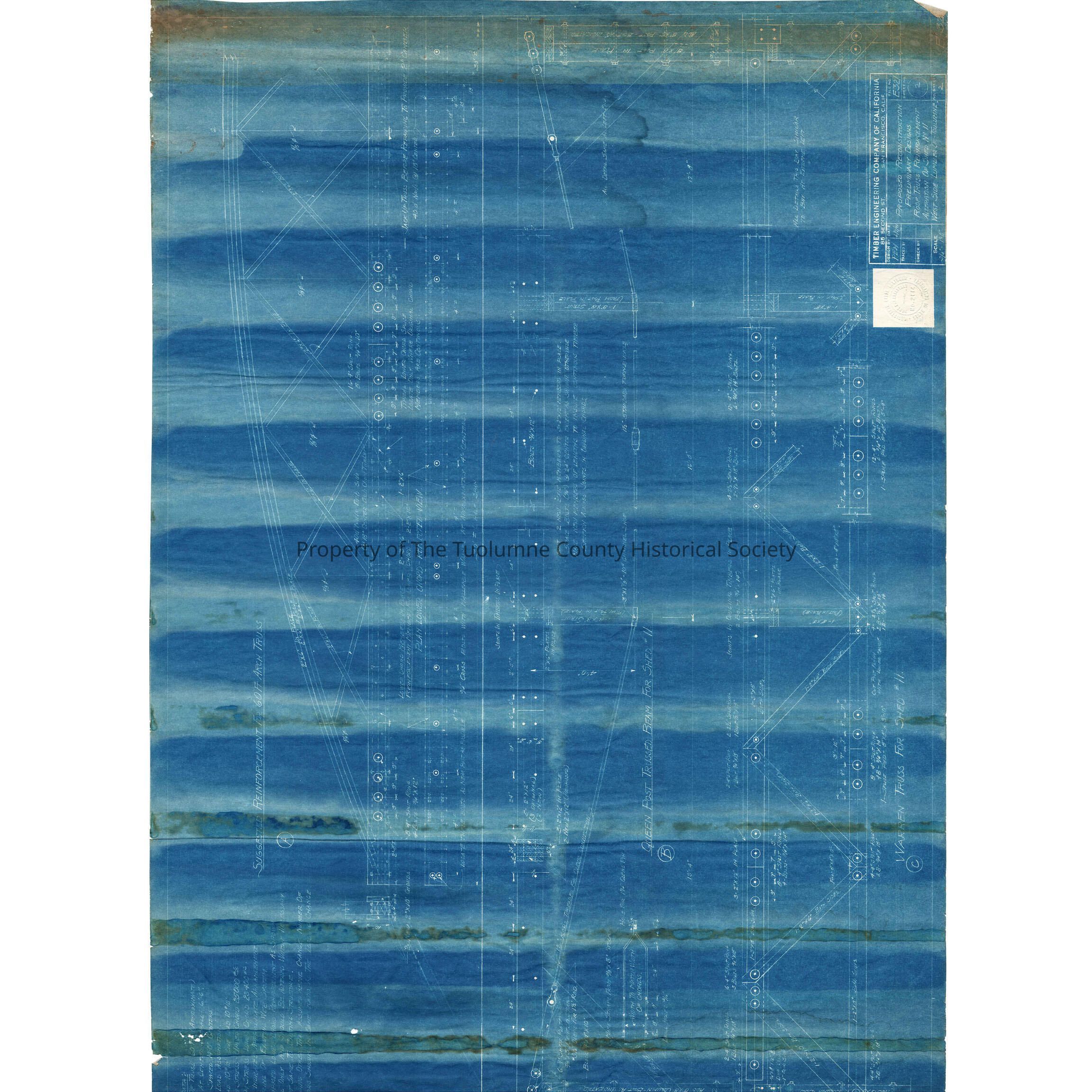 A blueprint of a Proposed Reconstruction Preliminary Designs Roof Truss Reinforcement Alteration of Shed No.11 for West Side Lumber Co. The blueprint was provided by the Timber Engineering Company of California of San Francisco. This is sheet 2 of 2 sheets. The ceiling roof structure is an arch truss. Threaded steel rods of some length are bent over queen posts then tightened via a turnbuckle to provide structural strength to the roof. At the upper left there are instructions and data pertinent to the construction of the arch truss. Based on 14 foot centers (for the x brace members) there are load stress assumptions stated along with other information. The lower drawing is for a Warren truss, but I'm not sure where it fits into the shed.