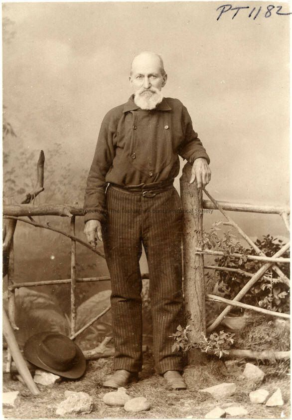 Portrait of an unknown man. In a studio setting with a fences, bushes, hat on the ground and rocks. The man is standing at the corner of the fences with his left arm on a post. He's wearing long stripped pants and a long sleeve dark shirt. He has his hair pulled back and is baldish to top with a large beard.