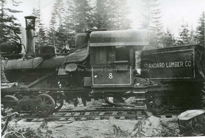 Photograph of steam engine Heisler #8 after it collided with train Shay #3 at Camp Pickering #2. Taken near Moccasin Creek.