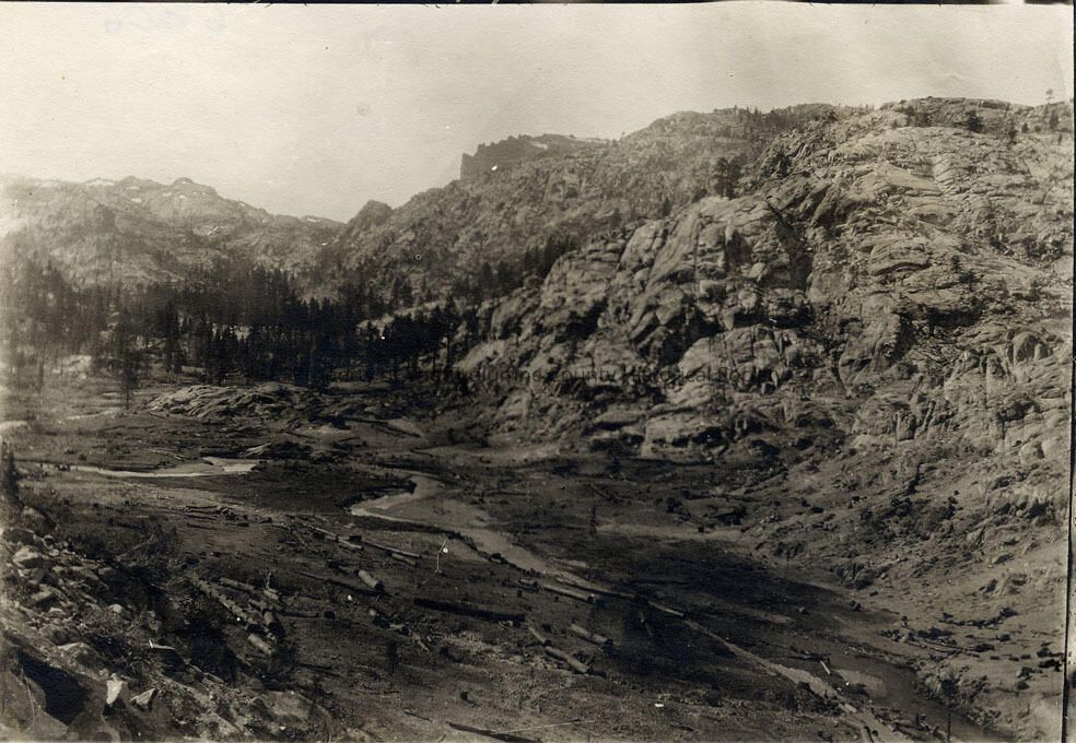 A black and white photo of the Union Construction Company, Vallecito, Ca. Relief Dam construction. Upper end of the valley where a small saw mill was operated to cut the lumber needed for camp buildings and dam construction.