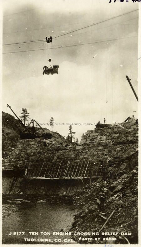 Union Construction Co.-Ten ton engine crossing Relief Dam. Photo during construction of Relief Dam 1906 through 1909. Building by Union Construction Co. Sanderson and Porter, Engineers, 1906/07, Bacon Davis, Engineers, 1908-09; Ray Fulcher, Engineer in Charge. 1908-09.