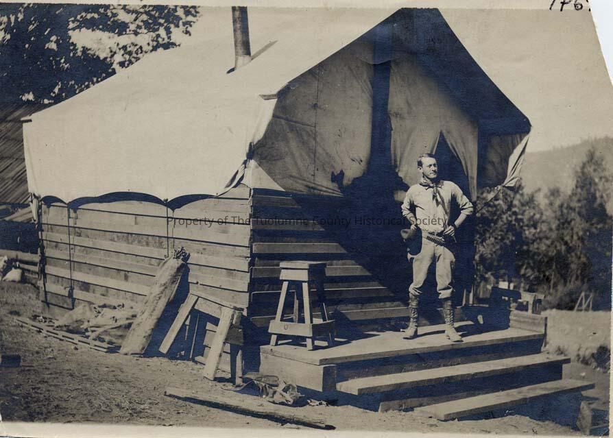 A black and white photo of an unidentified man standing outside of a tent. No information available on photo.Collection