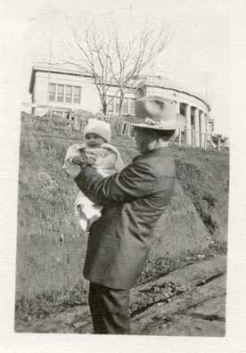 Black and white photo. Sonora Grammar School (the “Dome”) in the background, man and baby not identified. Type: Paper