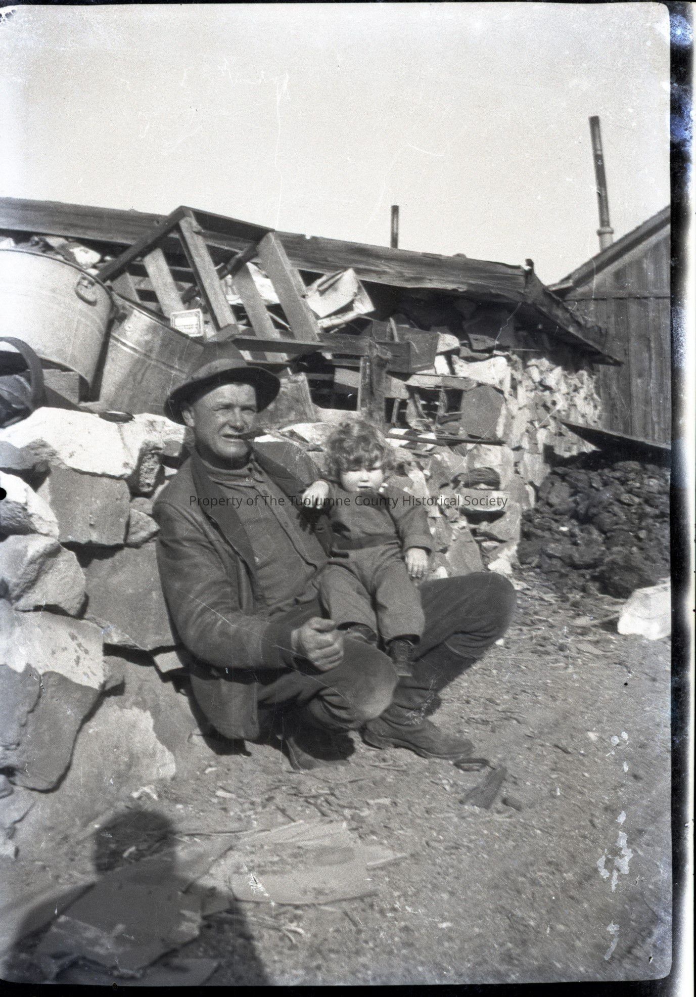 A black and white photo negative of an unidentified man and small child sitting in front of a rock wall with two wash tubs behind them. The man has a cigar in his mouth.Collection