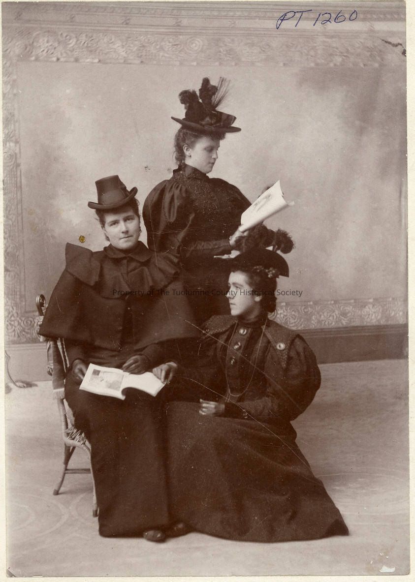 Portrait of 3 Ladies, not identified. two of them are sitting and one is standing. The lady in the sitting in the chair is wearing a black dress with a black shale around her shoulders, a hat and is wearing dark gloves, with a book in her lap. The lady standing is in the back looking at a book the she is holding. In a dark dress with puffy shoulders, she's is wearing an hat with a ribbon and feathers. The other lady that's sitting is wearing a dark dress with buttons going up the front of the blouse, puffy shoulders with buttons on the shoulders and an hat with feathers and a ribbon, she is looking to the side. She also has a necklace and gloves.