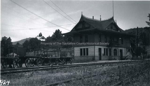 View of the depot, with four flatbed wagons in the right foreground and the rails in the extremem foreground. Shows a large house on the hill in the background.Lexicon
