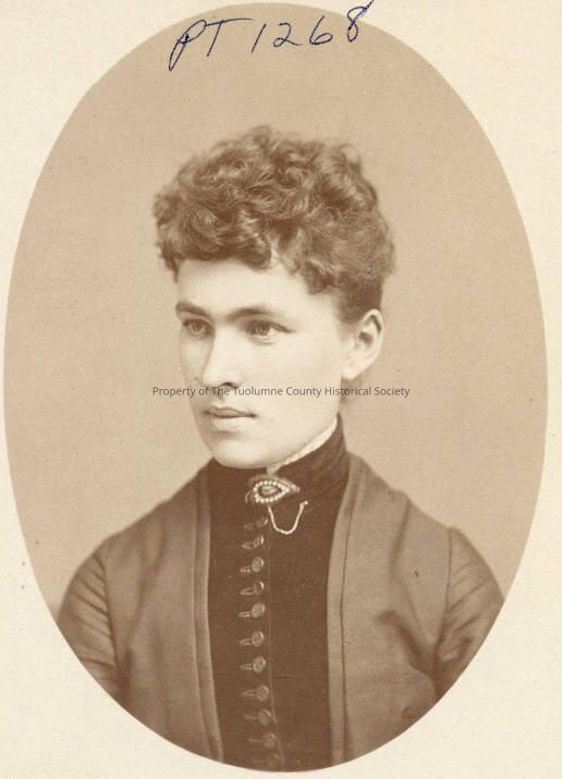 Portrait - Lady not identified. Studio scene, upper body. Blouse buttons up in the front. Has a broch with a chain on her collar. Hair is curled on top.