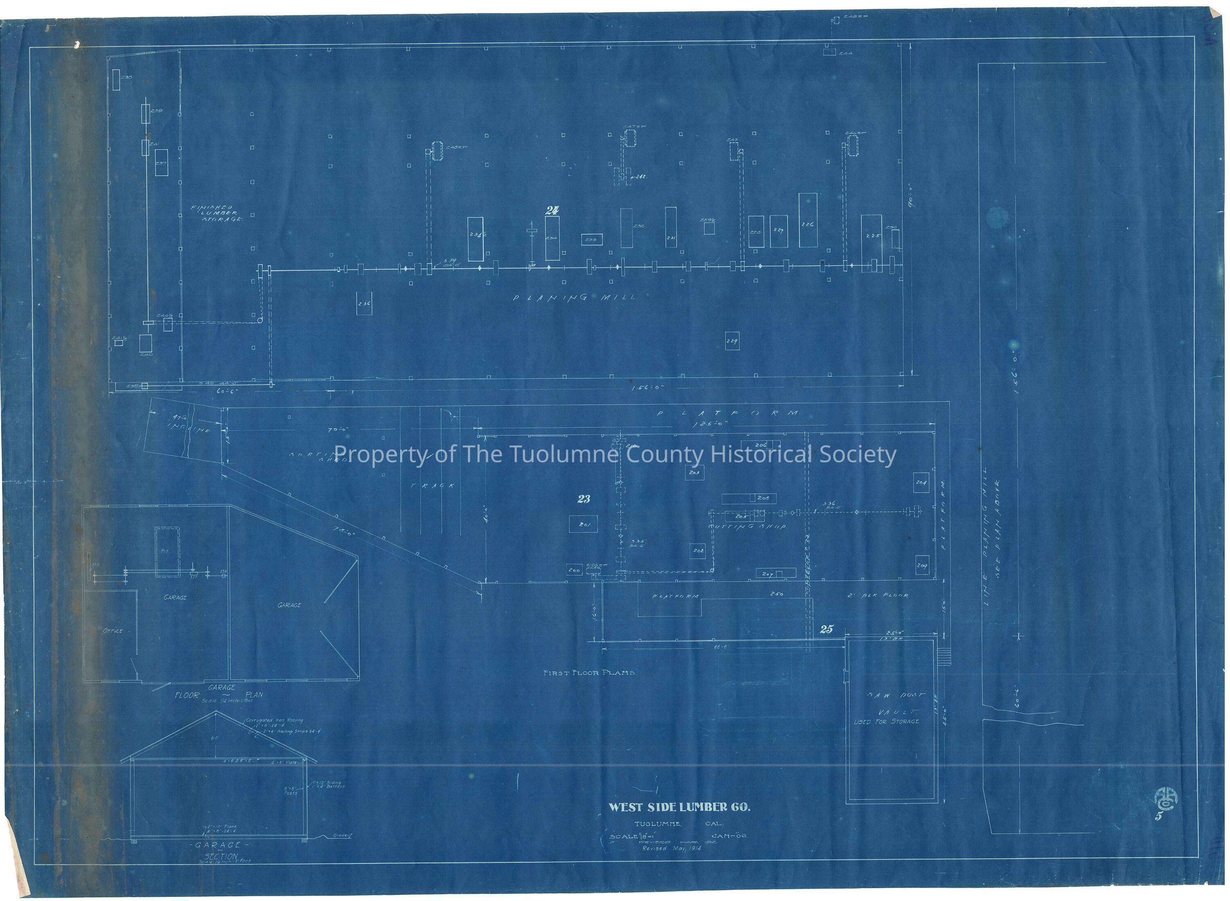 blueprint of planing mill, garage; includes sectionals and floor plans