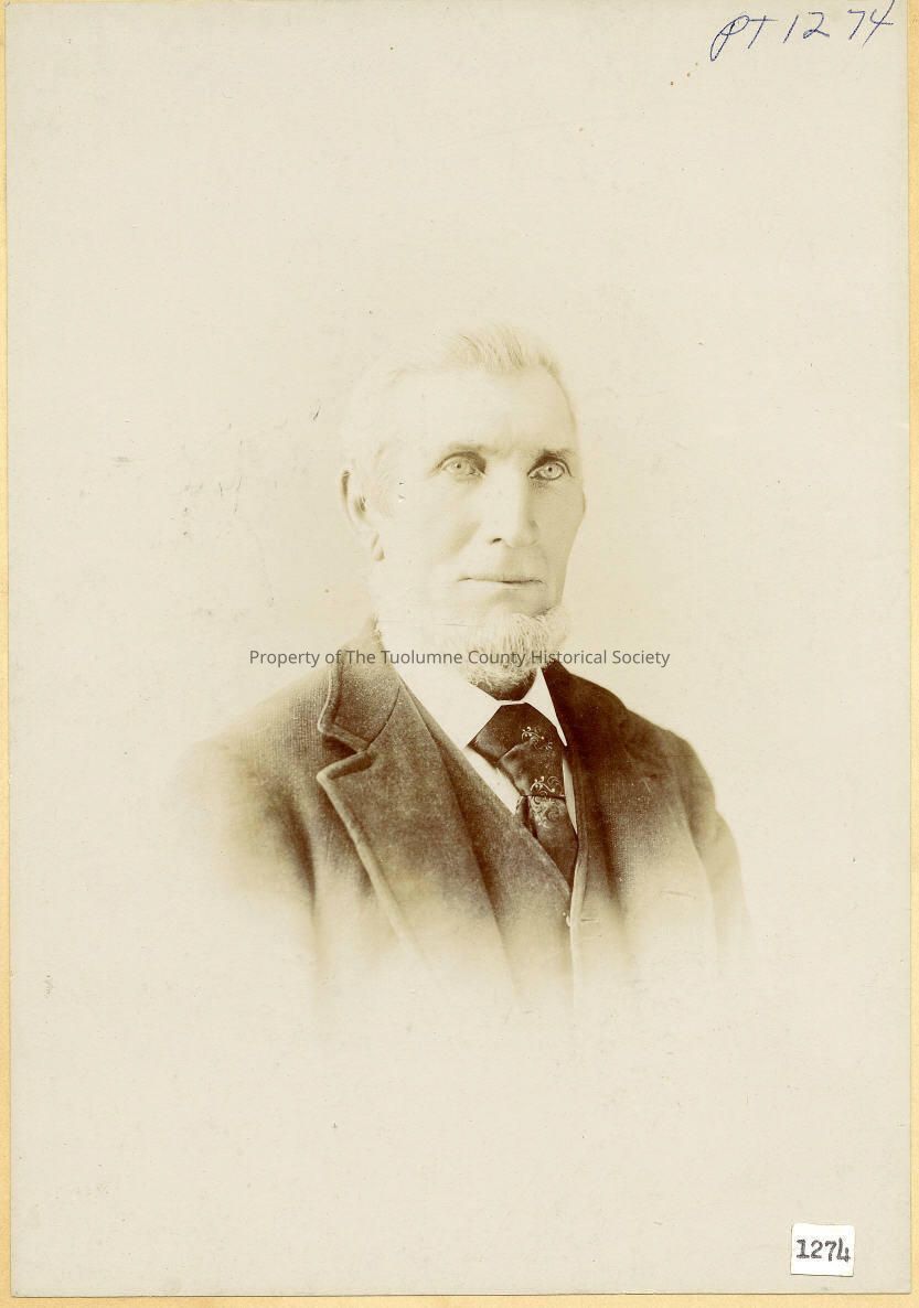 Portrait - Man not identified. Studio setting. Upper body photo. Wearing a 3 piece suit, with a print tie tied in a winsor knot. Has a chin beard.