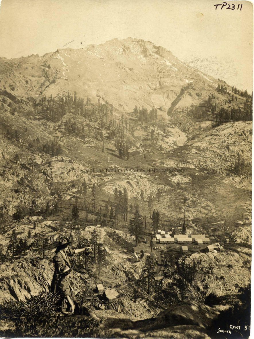 Landscape - Buildings for the workers that work on constructing the Relief Dam. Two women in foreground not identified. Type: Paper