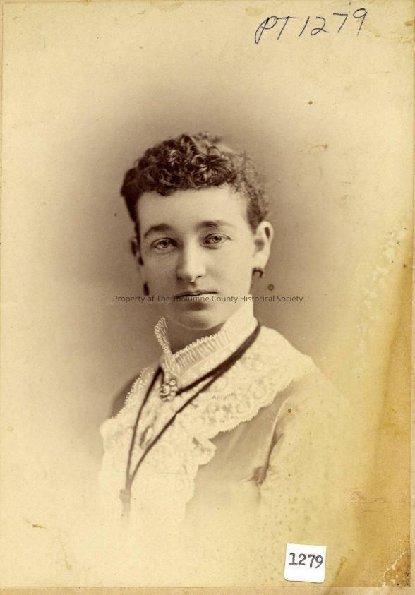 Portrait - Lady not identified. Upper body photo. The dress has a large and long lace collar that's going down the front of the dress. There's is a long necklace and an short necklace with a broch with a locket hanging form it. She has short curly hair and is wearing earrings.