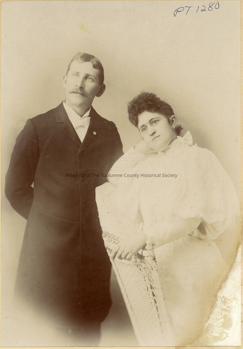 Clothing, People, Photography, Lady and man not identified. Studio setting. The man is standing to the side and in back of the lady. He is wearing a suit with a long coat that has a pin on the lapel and a white bow tie. He has a full mustach. She is standing leaning on the back of a wicker chair with one hand behind her head. In a white dress and wearing glasses., Biography, Unidentified