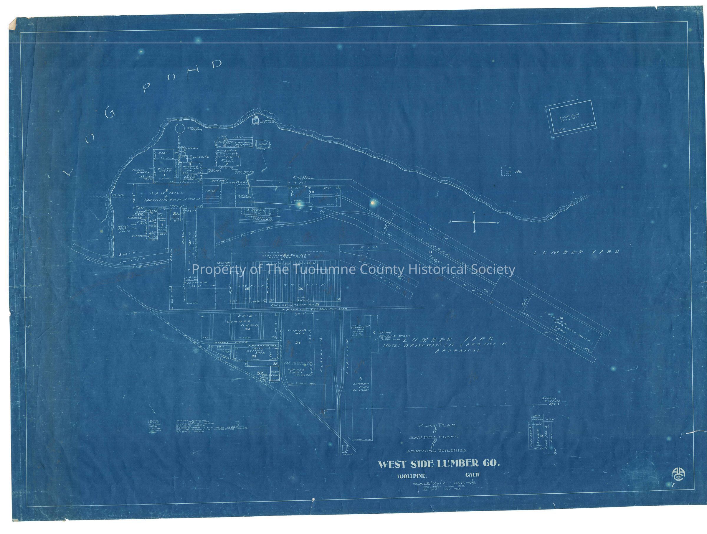 blueprint showing location of sawmill, dry kilns, planing mill and lumber sheds, West Side Lumber Co.