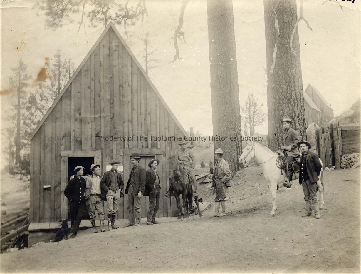 Building, Relief Dam office. Men standing in front of the office. Two men are on horses. None are identified. Type: Paper