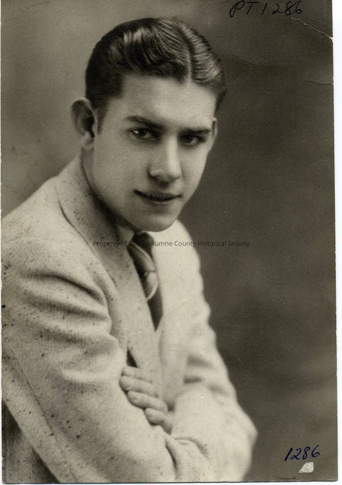 Portrait - Young man not identified. Studio setting. Standing sideways in a tweed coat with a striped tie. Head turned looking at the camera and his hair is parted in the middle, with short sideburns.