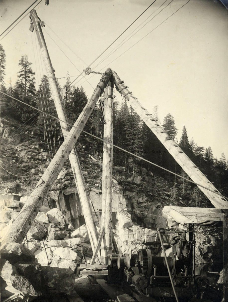 Landscape - A man operating a crane motor and the crane that move the granite rocks at the Relief Dam.
