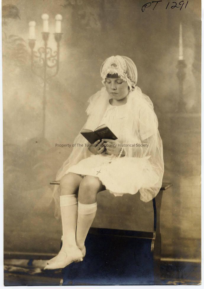 First Communion Portrait - Girl not identified. Studio setting. Sitting on a bench holding and reading a book. Wearing white slip on shoes, knee high socks, white dress and a head covering with a veil that hangs down to her waist. Holding a pearl necklace with a cross.