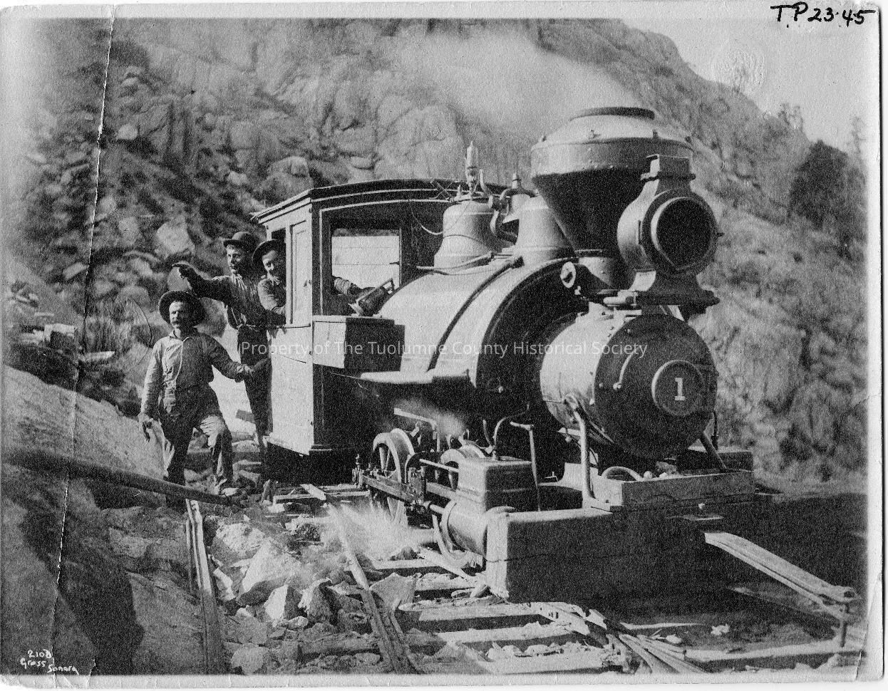 Identified as: Porter engine used in the construction of the Strawberry Dam and the Relief Dam. Printed on back: Building Strawberry Dam - approx 1913 - Pinecrest. Porter engine