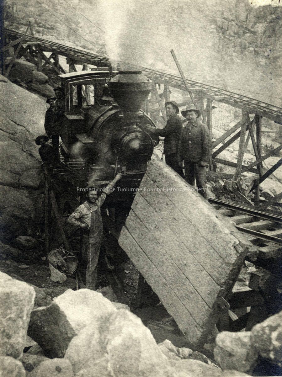Black and white photo, 8.25 x 6.25, showing 3 men standing in front of steaming engine, 3 more men just visible on side of engine, working with a large slab, maybe concrete or wood. Rocks in foreground, wooden railroad trestle in background.