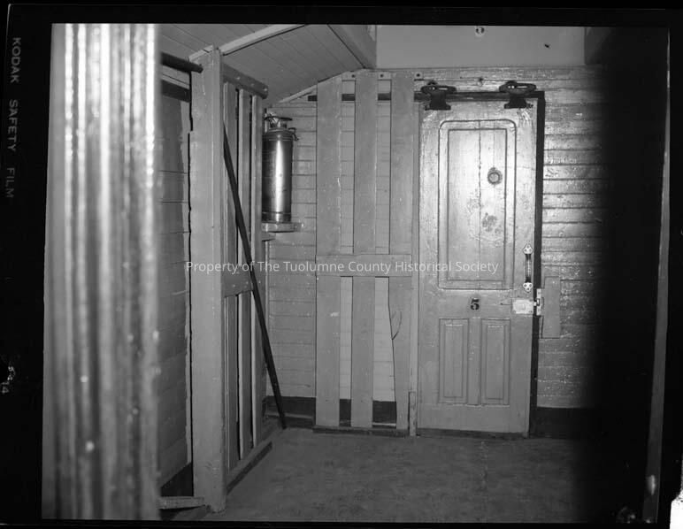 Negative for photo TP17721, Sierra Railroad. According to "A Railroad Transplant, The Sierra Railway Company of California" by Richard Rosenquist the coach pictured here appears to be #5, (seen on the door). Coach number 5 was constructed with a short wheel base for use on the Angel's Branch line with it's sharp curves and switch backs.