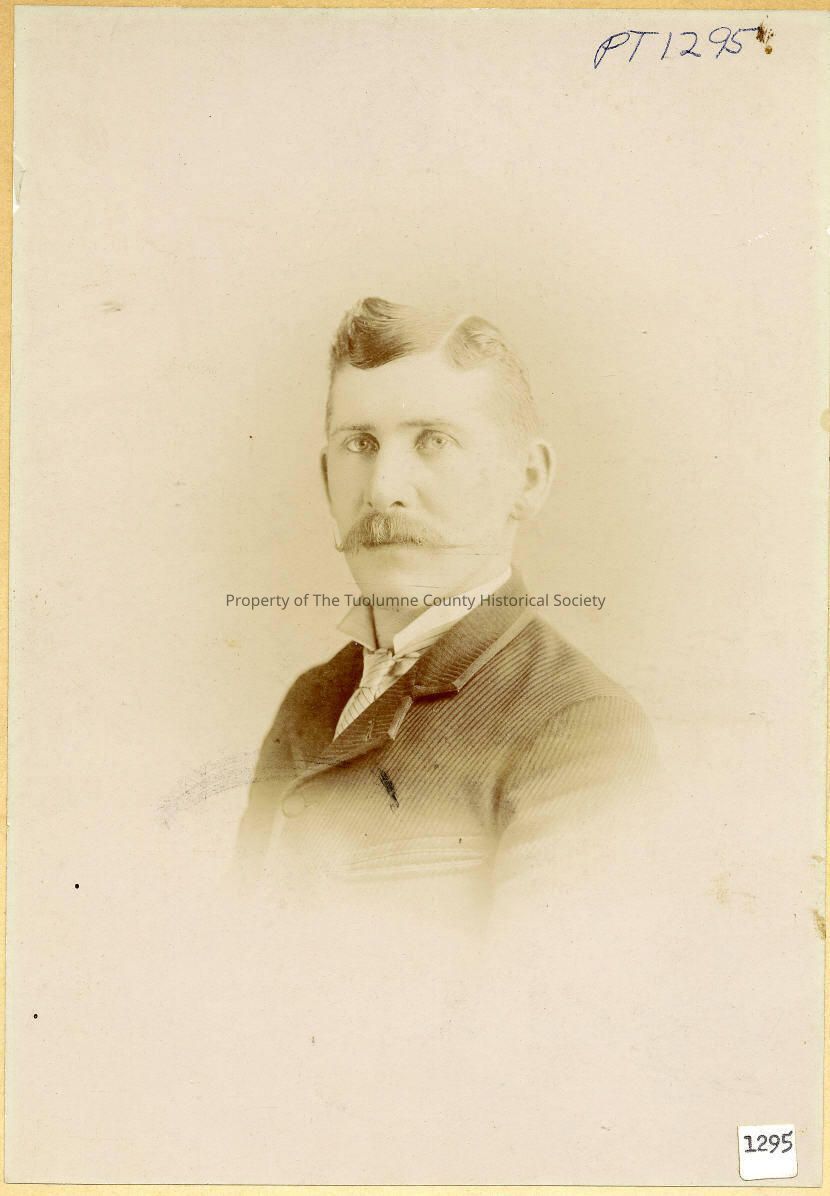 Portrait - Man not identified. Studio setting upper body photo. He is wearing a corduroy jacket with a striped tie and high collar. Hair is parted to one side and has a handle bar moustache.