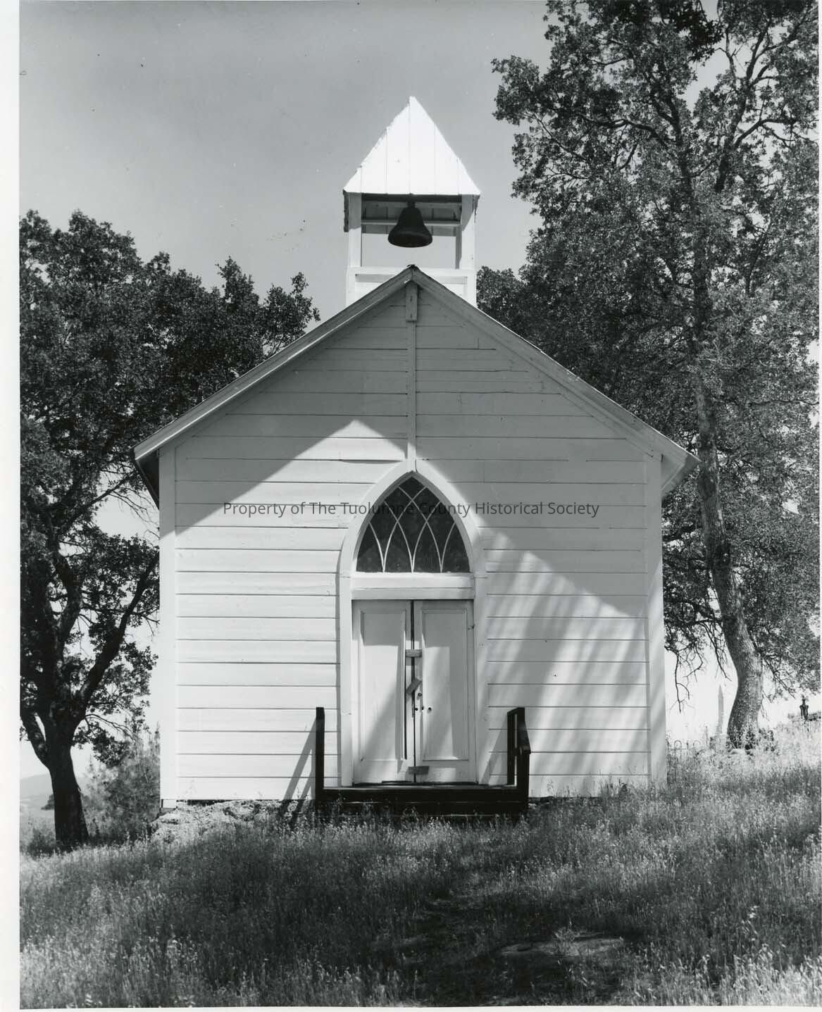 Chinese Camp after Restoration. Built in the 1850's. The first mass after restoration was in 1947. The wooden building has a bell tower. Above the front doors are stained glass. Steps go up to the door. Trees surround the church.