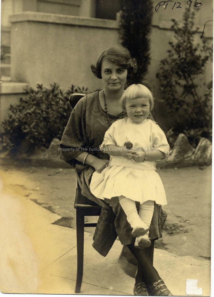 Portrait - Lady and small girl not identified. They are sitting in a chair in the driveway in front of a house. The lady is wearing buckled shoes, print dress and dark socks she has a necklace and is wearing a bracelet. The child is sitting in her lap. She has white lace up shoes, white knee high socks, white skirt and blouse with bows on the sleeves. In the background is the front lawn, landscaping and the front entrance of the house.