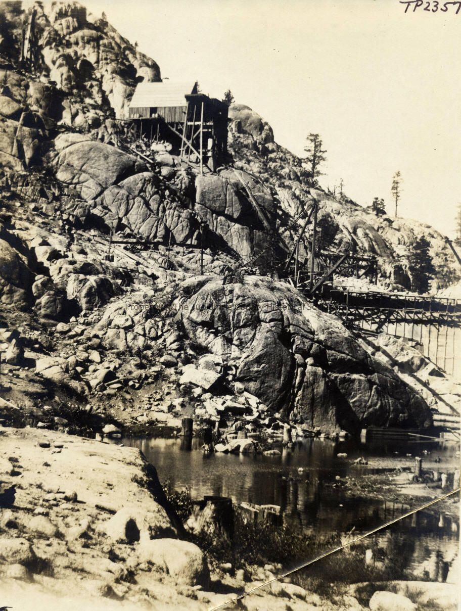 Landscape - Showing construction of Relief Dam. Part of the dam wall, water in the valley floor and a building on the hill.