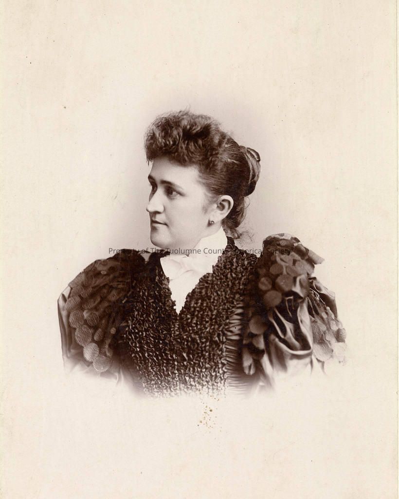 Portrait, unidentified woman, studio setting, 3/4 profile. She is looking to the side. Pictured in dark dress with white collar, large decorated sleeves and ruching down bodice front. She wears her hair in a chignon with a pouf of curls on the front and earrings. Wells Studio, Sonora