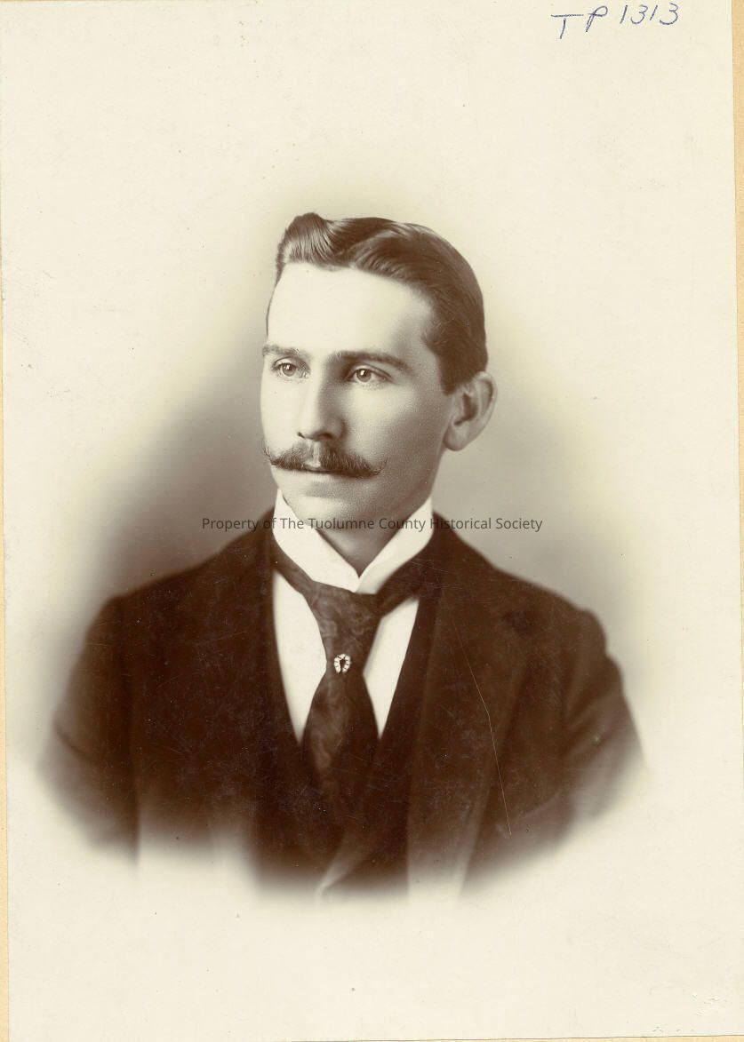 people, Unidentified man, Men's fashions, Neckwear, Stickpin, Men's hairstyles, Moustache, Sears studio, Sonora, Unidentified man, black and white portrait, bust, pictured wearing dark three-piece suit with dark tie and starched collar, horseshoe shaped jewelled stick pin, hair parted in center, moustache. Sears Paris Panel Portrait, Sonora.