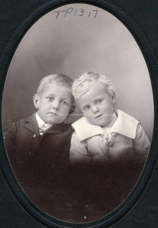 People, Unidentified, very young boys, Children's fashions, Children's hair styles, Sonora, Portrait, vignette, two young boys,youngest with blonde curls parted on the side, wearing sailor style suit with large white collar, older boy has darker hair cropped short parted on the right and combed to the left, wearing dark coat buttoned close to the collar, bow tie. Photographer not credited.