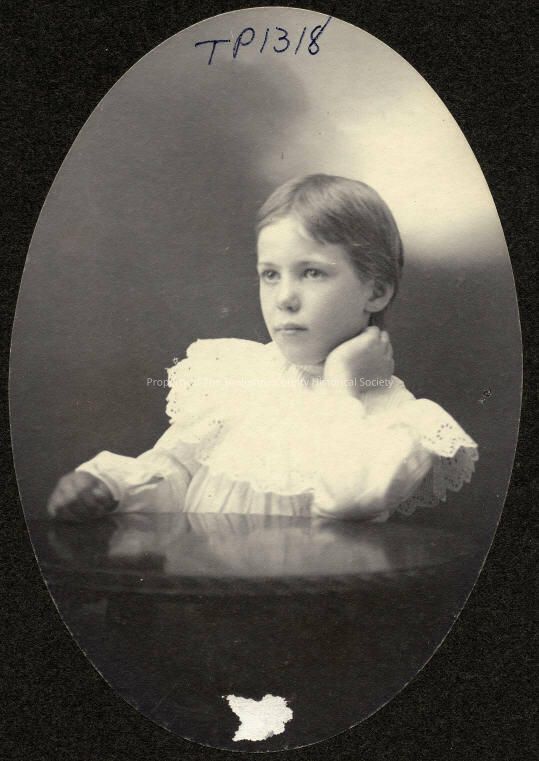 People, children, Unidentified child, Children's fashions, Posed at table with left hand on neck, Hair is center parted and drawn back over the ears, Lace "picture" collar, Sonora, Black and white portrait, vignette, unidentified child, subject is dressed in white long sleeves with large circular lace collar, posed behind table with hand on neck, hair is parted down the center and drawn back over the ears. Photographer not credited.