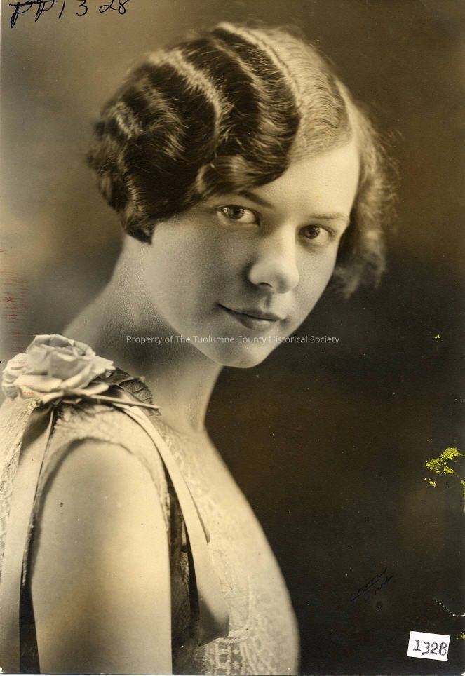 People, Unidentified young woman, Women's hair styles, Women's fashions, bobbed hair, fingerwave, Unidentified lady,portrait, she is pictured in profile with her face turned toward the camera, dressed in a sleeveless lace dress with a rose and ribbon on her shoulder, her hair is bobbed, parted on the left and combed to the right in fingerwaves. Photographer is not credited.