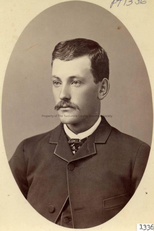 People, Unidentified man, Men's fashions, Men's hair styles, Moustache, Wells Studio, Sonora, unidentified man, black and white portrait, he is pictured dressed in dark three piece, small lapel buttoned to throat and edged with twill ribbon, collarless shirt and figured ascot. His hair is trimmed close to the ears, parted on the right and combed to the left, trimmed moustache. Wells Studio, Sonora