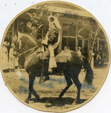 Unidentified man on horseback. Man dressed with banner over shoulder and draped foot. Wearing a plumed hat. People standing on sidewalk, ladies dressed in long dresses. c. about 1900.