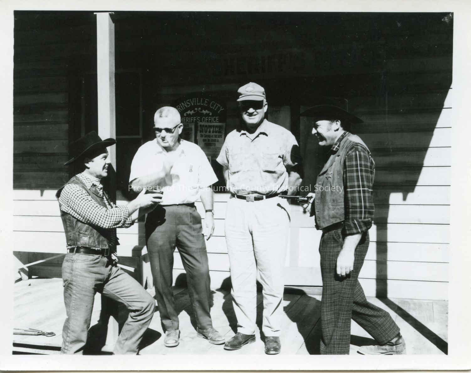 A black and white photo of four (4) unidentified men standing in front of a building. No other information available on this photo.