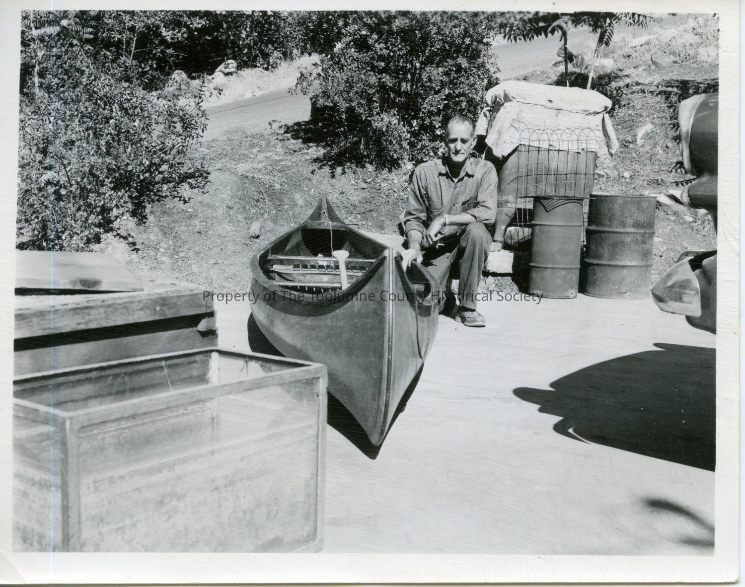 A black and white photo of an unidentified man kneeling beside a canoe. No other information available on photo. Type: Paper