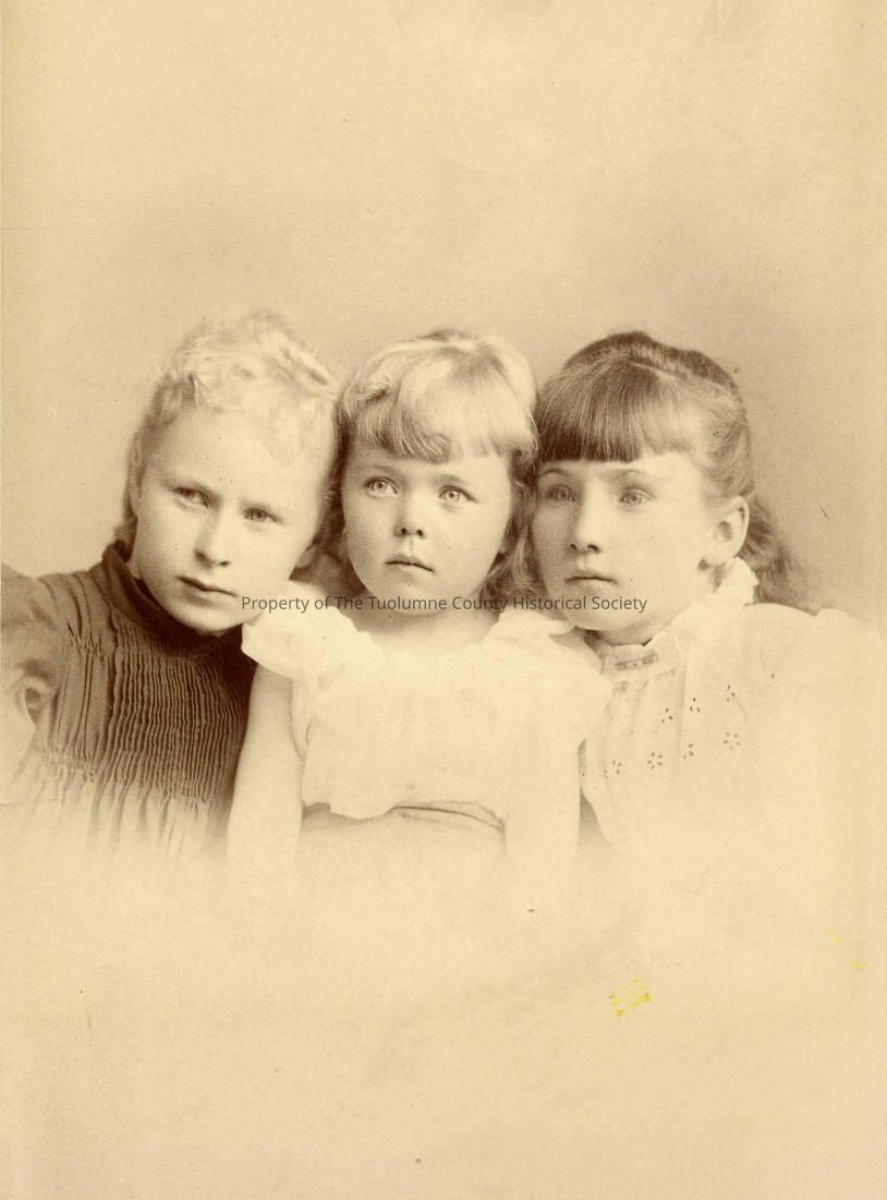 People, Group of three, Children's fashions, Children's hairstyles, Wells Studio, Sonora, Group of three unidentified young girls circa - 1880 - 1910, vignette, two are dressed in light colors, an eyelet bodice and ruffled layers, these both have bangs with the hair pulled back, the third girl is wearing a dark color with hairpin pleating and puffed sleeves her hair is loosely piled curls. Wells Studio, Sonora CA