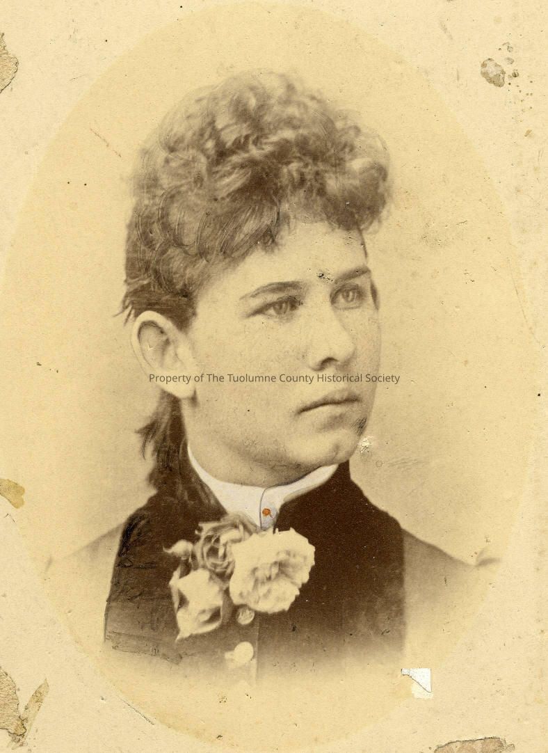 People, 1882, April 12, 1882, Unidentified woman, Initials C.S., Women's fashions, Women's hairstyles, Unidentified woman, black and white portrait, she is pictured wearing a dress with dark colored, pleated bib, white with black trim blouse, and roses at the neckline, her hair is curly on front and pulled back with nape hair, no jewelry. Photo is dated April 12, 1882 and marked C.S., Photo studio is not credited.
